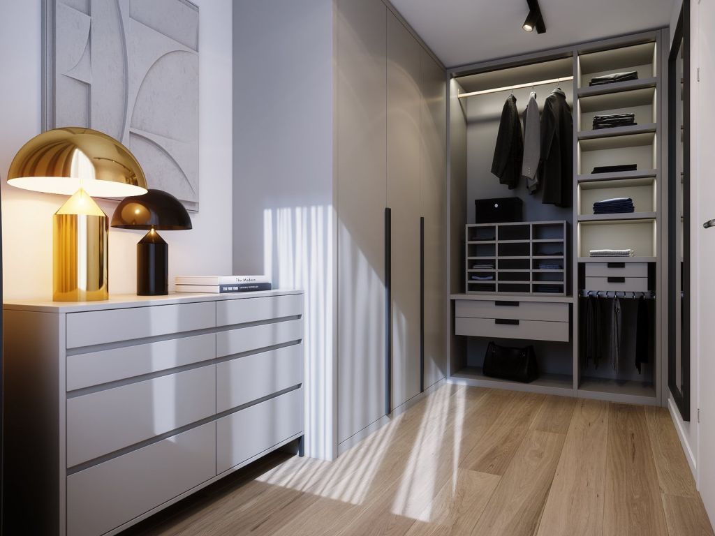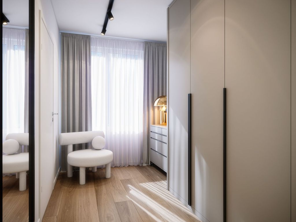 Bedroom and new custom closet for this appartment next to the iconic Amsterdam central station. This design was made for a lady who wished to have a makeup area in her bedroom and a fully renovated walk in closet in her second bedroom, the greens, greys and beiges took over this design making the black fixtures and cabinets centers of attention in the bedroom area and the beige material of the closet allowed the space to feel much bigger, creating a relaxing sophisticated atmosphere.