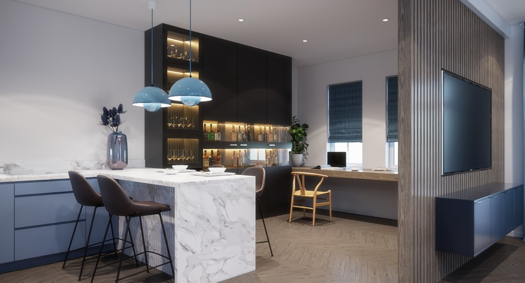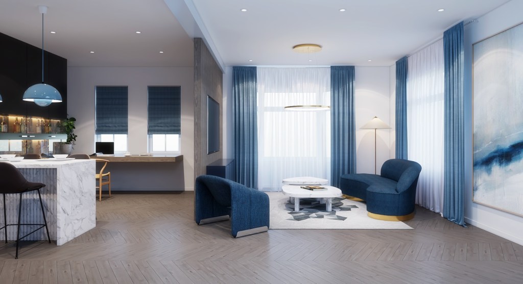On this project, I encountered a client who was driven by the shades of blue, an IT professional who envisioned his new apartment through a sophisticated glass, wood, and shades of blue idea.