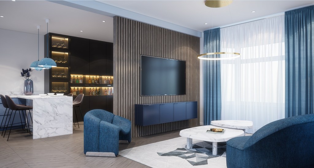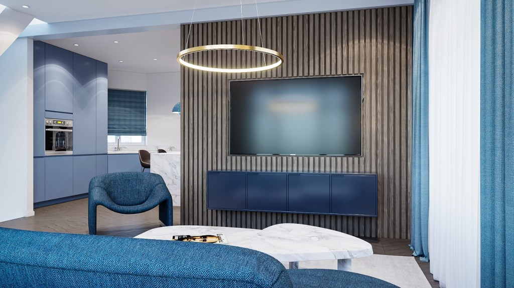 Tasteful living room giving point views to the blue tonalities and the wooden work designed for this place.