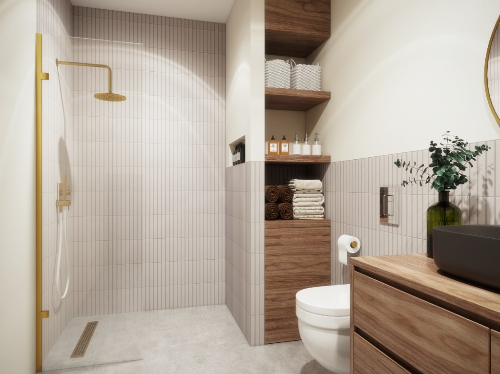 Bathroom tiling work and walnut custom cabinets for this fully renovated bathroom.