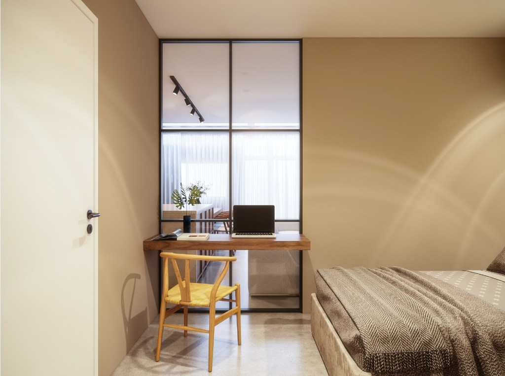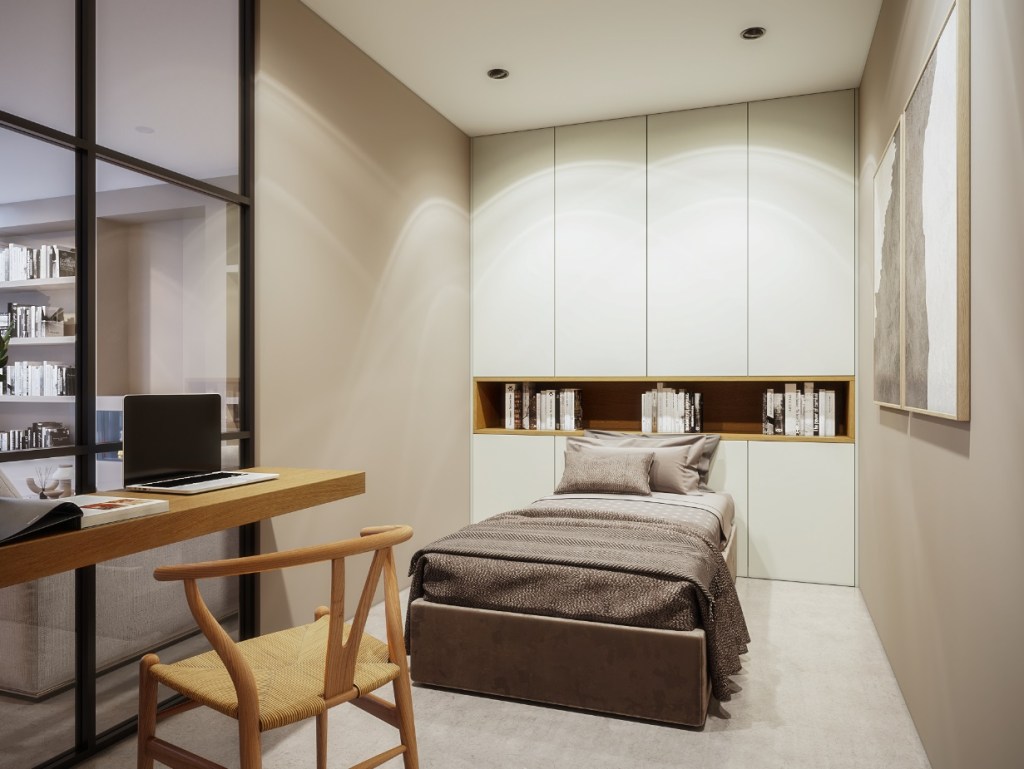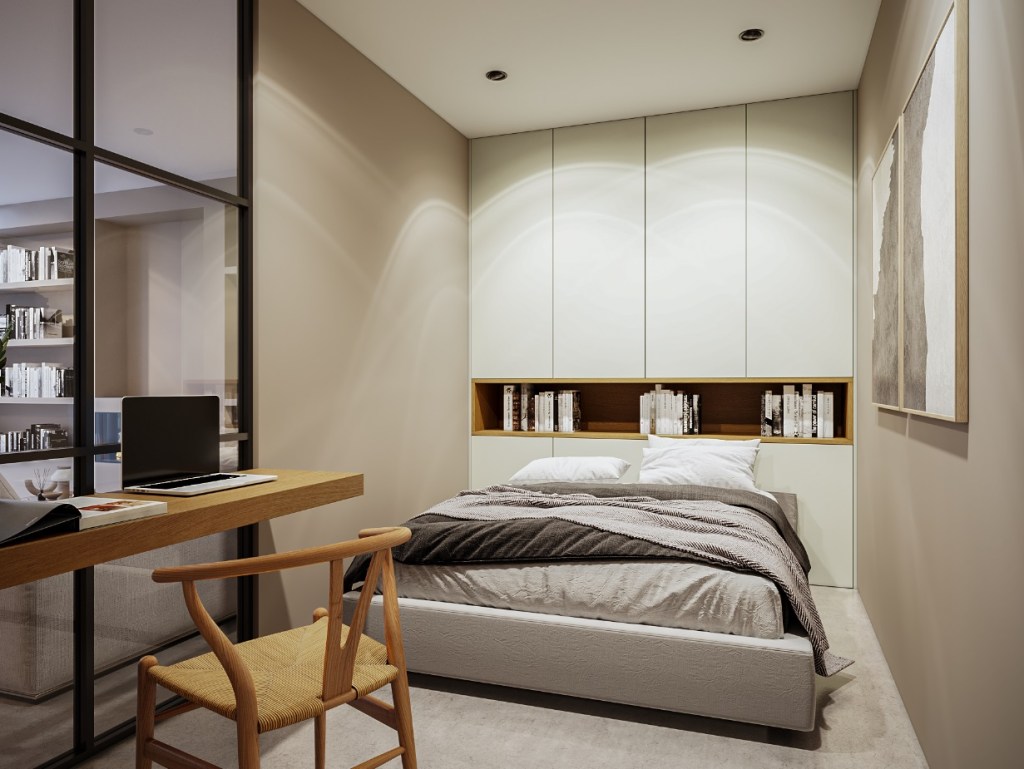 The clients had a request on feeling the warmth of the walnut wood in their bedroom as well, the closets are custom made for them.