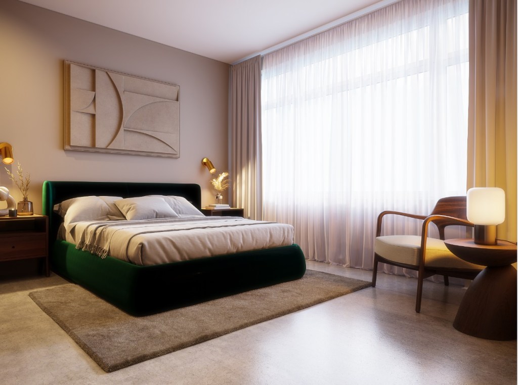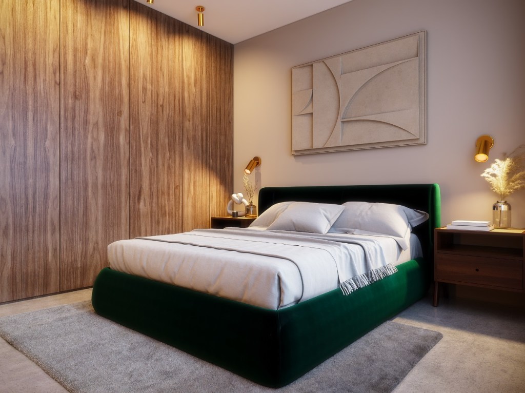 The bedroom continues playfully the green accents working with natural materials allowing the space to feel luxurious and modern without being too outspoken. The neutral tone art piece and the polished cement flooring bring the modern look all together.